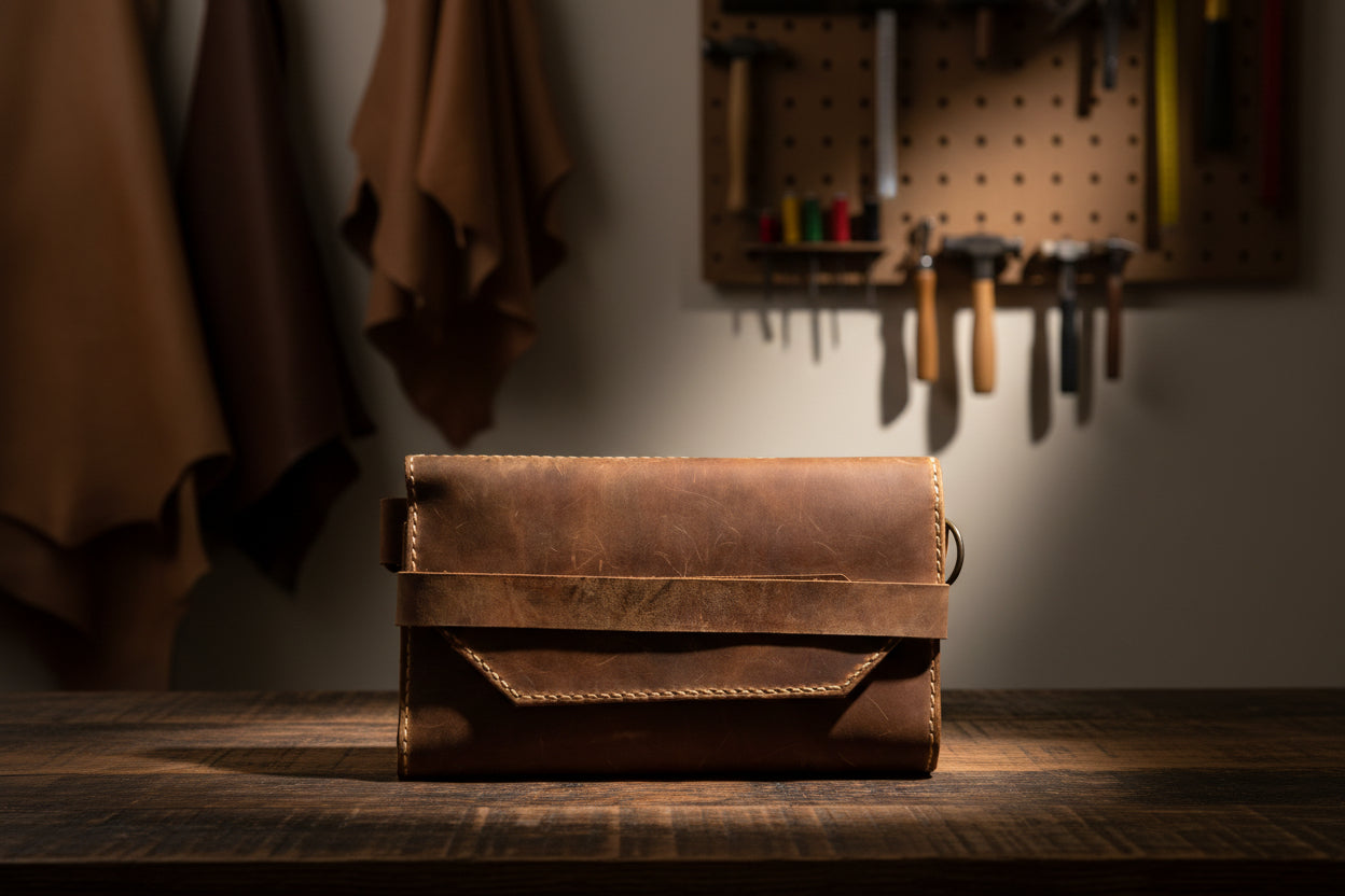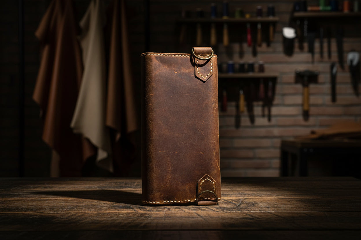 Çift Renk Estetiği: Dış yüzeydeki koyu kahverengi derinin ağırlığı, iç kısımdaki taba rengi bölmelerle modern bir kontrast oluşturur.